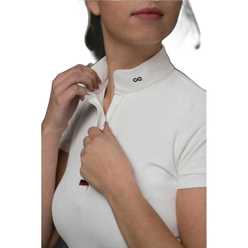 Le polo de concours femme Presteq AmbitionFirst allie élégance et performance grâce à son tissu technique innovant et ses détails pratiques pour une équitation de haut niveau.